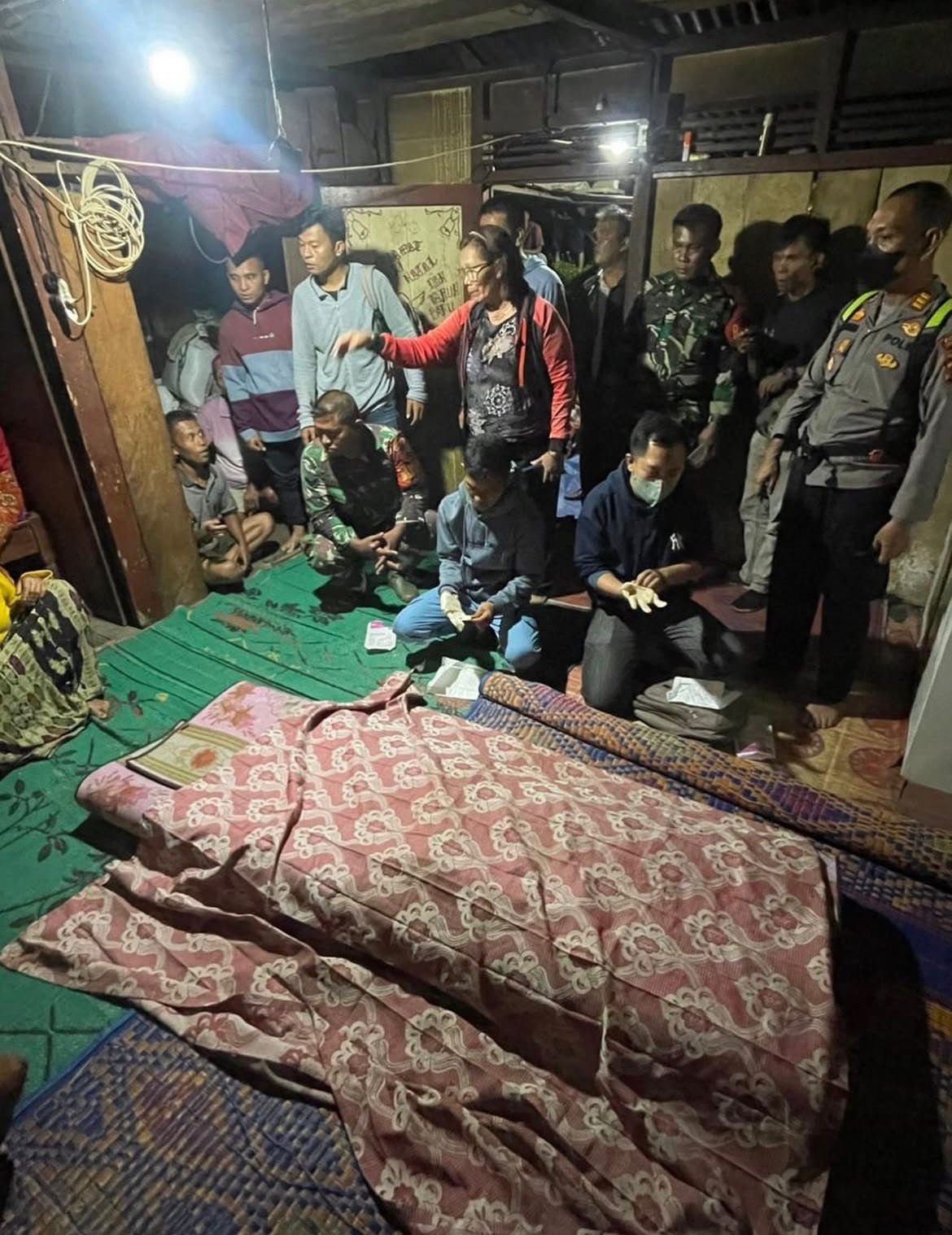 Suasana rumah duka korban penganiayaan di Desa Hudopa Nauli, Kecamatan Kolang, Tapanuli Tengah, saat jenazah disemayamkan dan ditutup kain sebelum proses pemakaman.